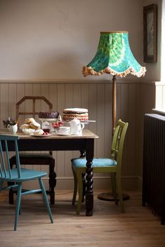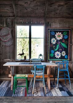 Cadeiras de cores vivas numa sala de jantar cheia de cor!